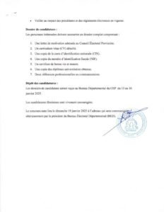 Le concours de recrutement se tiendra le dimanche 19 janvier 2025. L’adresse sera communiquée par le président du Bureau Électoral Départemental (BED).